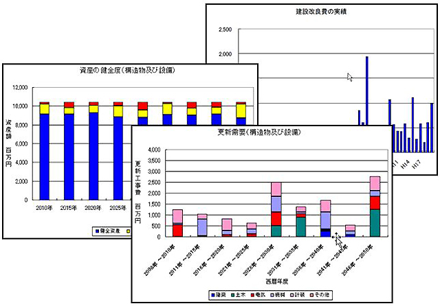 (更新工事費シミュレーショングラフ、資産健全度シミュレーショングラフ、工事実績グラフ、LCC計画一覧)