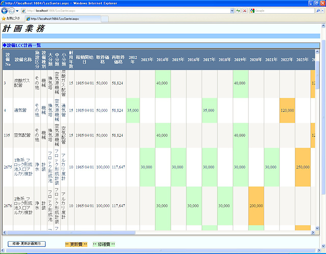 - 施設、設備の重要度・優先度を加味して適切な更新時期を提示し、工事実績、維持管理費を基に今後の補修費を想定します。