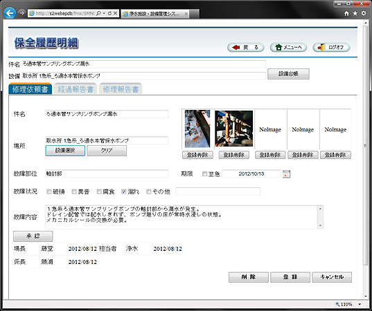 - 修理依頼書、経過報告書、修理報告書の作成、回付、供覧で進捗状況等を全員で情報共有できます。