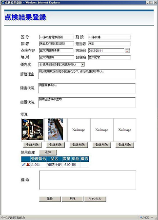 - 点検結果(登録)報告書は写真や材料費、優先度を登録できます。